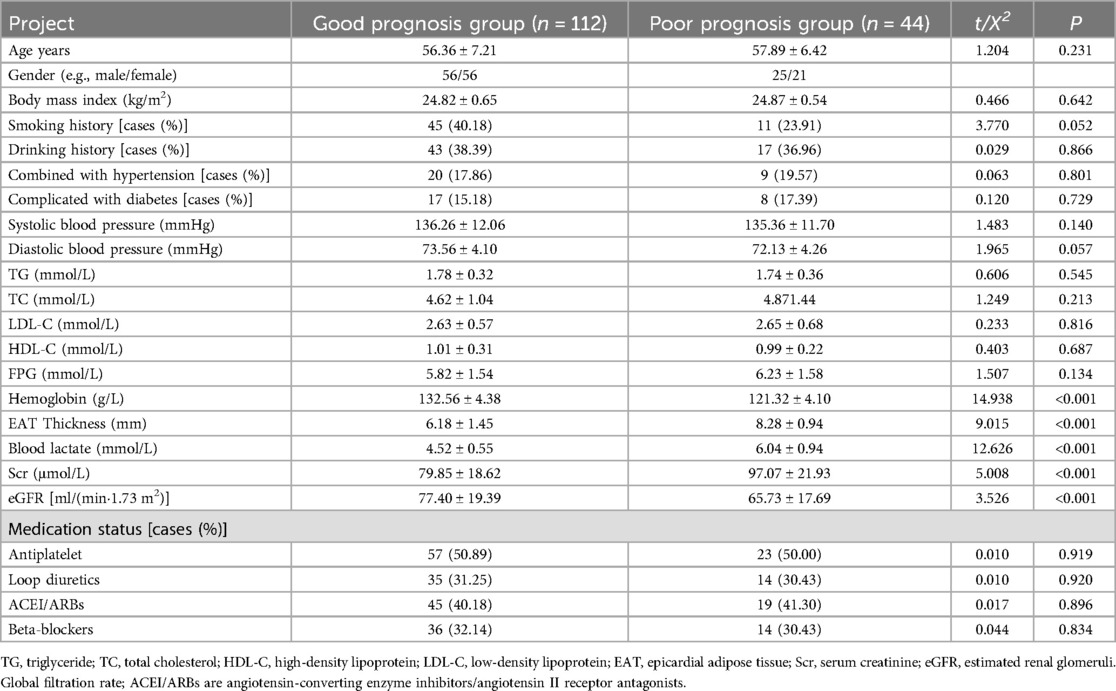 In this study, the total number of patients with poor prognosis at the end of follow-up was 44. The results of a univariate analysis showed that the clinical data of age, sex ratio, body mass index, smoking history, drinking history, combined hypertension, combined diabetes mellitus, systolic blood pressure, diastolic blood pressure, triglyceride, total cholesterol, low-density lipoprotein, high-density lipoprotein, and medication use in the poor prognosis group had no statistically significant differences when compared with that of the good prognosis group (P > 0.05). Hemoglobin and estimated renal glomeruli (eGFR) levels in the poor prognosis group were lower than those in the good prognosis group (P < 0.05). EAT thickness, blood lactate level, and serum creatinine (Scr) level were higher in the poor prognosis group than in the good prognosis group (P < 0.05). The results are presented in Table 3.