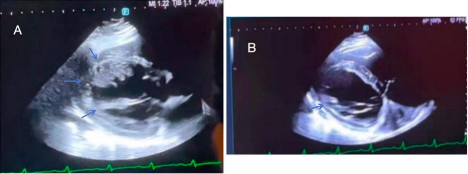 (A) On the fourth day of hospitalization, UCG revealed biatrial/right ventricular enlargement, left ventricular wall motion abnormalities, reduced LVEF (42%), mild left ventricular wall thickening (4 mm), intraventricular thrombus, and pericardial effusion. (B) On the thirteenth day of hospitalization, UCG revealed an interventricular septum measuring 15 mm, an LVEF of 34%, reduced left ventricular thrombus and normal right heart function.