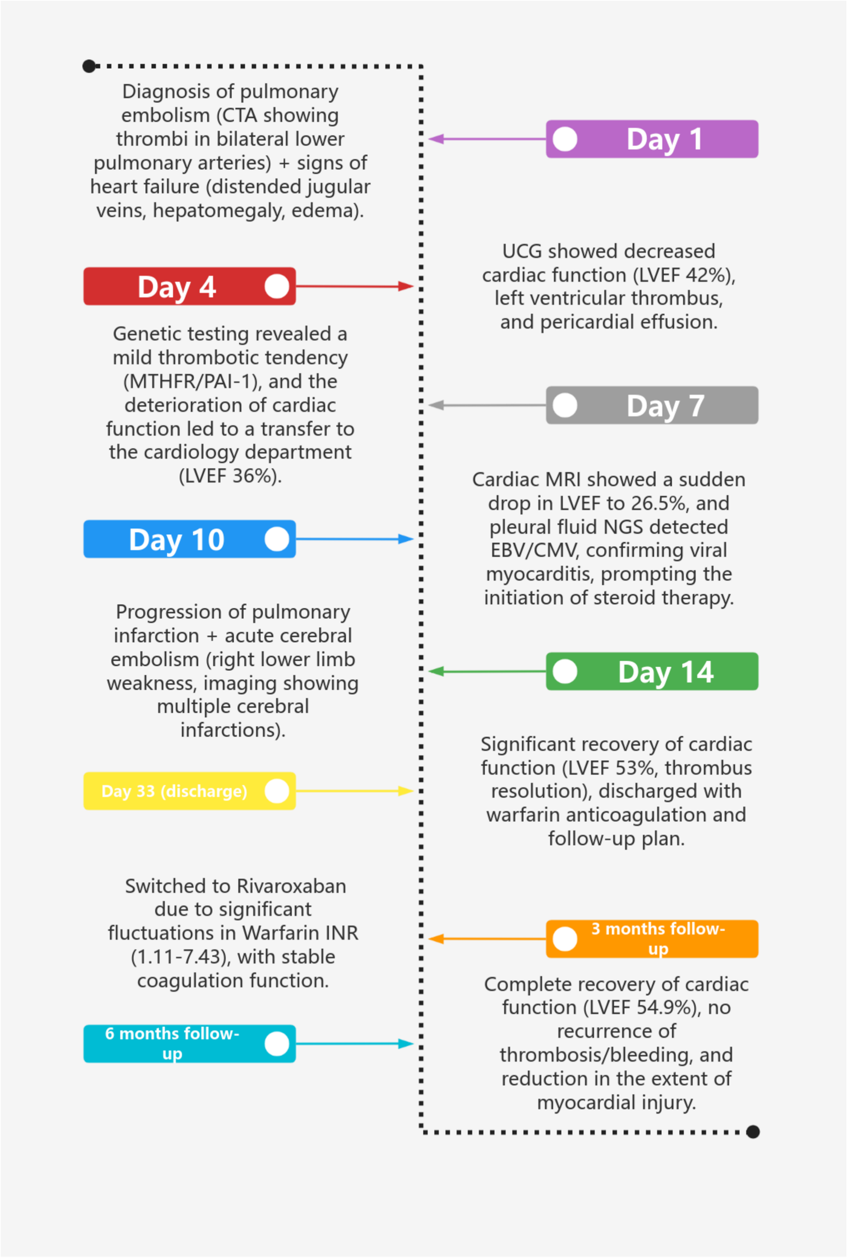 A follow-up pulmonary CTA should be conducted to assess for pulmonary embolism. Regular follow-ups are necessary to adjust and optimize cardiac function medications, and periodic reviews of blood routine, stool routine with occult blood, liver and kidney function, electrolytes, blood lipids, ECG, and cardiac ultrasound are essential. The patient has been followed up for six months post-discharge and currently reports no discomfort, with stable vital signs. NT-BNP (91.85 pg/ml), Troponin I (TNI) (0.02 ng/ml), suppression of tumorigenicity 2 (ST-2) (7.16 ng/ml), and LVEF (54.9%) are all within normal ranges. Myocardial MR perfusion indicates a reduction in the extent of myocardial injury compared to previous findings. The patient received warfarin anticoagulation therapy after discharge; however, INR levels fluctuated significantly (1.11–7.43), and frequent dose adjustments were unable to maintain stability. In the third month post-discharge, due to poor INR control and an increased risk of bleeding, the treatment was switched to rivaroxaban (20 mg once daily, adjusted based on renal function). After this adjustment, during the three-month follow-up, coagulation function remained stable, with no recurrent thrombotic events or bleeding complications. The clinical course timeline is presented in Figure 3.