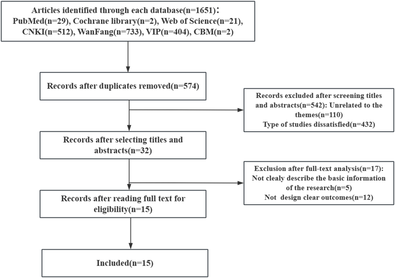 A total of 1,651 relevant articles were identified in the literature review, comprising 512 from CNKI, 404 from VIP, 733 from WanFang, 29 from PubMed, 2 from Cochrane Library, and 21 from Web of Science. Following the removal of duplicates and the sequential screening of titles and abstracts, 15 articles were selected for data analysis (Figure 2). Additionally, related guidelines such as the Guidelines for Cardiac Rehabilitation Programs by the American Association of Cardiovascular and Pulmonary Rehabilitation and the Guidelines for Cardiovascular Rehabilitation and Secondary Prevention in China were subsequently retrieved (49, 50). Outcomes reported in the reviewed literature were categorized into distinct domains. Following a team discussion regarding the practicability and feasibility of the items, five first-level indicators and thirty second-level indicators were developed based on five core perceptions: medication prescription, exercise prescription, nutrition prescription, psychological prescription, and smoking cessation for cardiac rehabilitation. The item pool comprises five dimensions assessing adherence to cardiac rehabilitation in patients with coronary heart disease (CHD), corresponding to five core perceptions in cardiac rehabilitation in China: exercise adherence (5 items), medication adherence (5 items), risk factor management adherence (8 items), nutrition management adherence (7 items), and psychology management adherence (5 items).