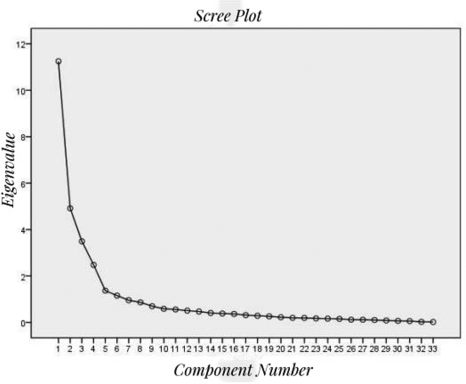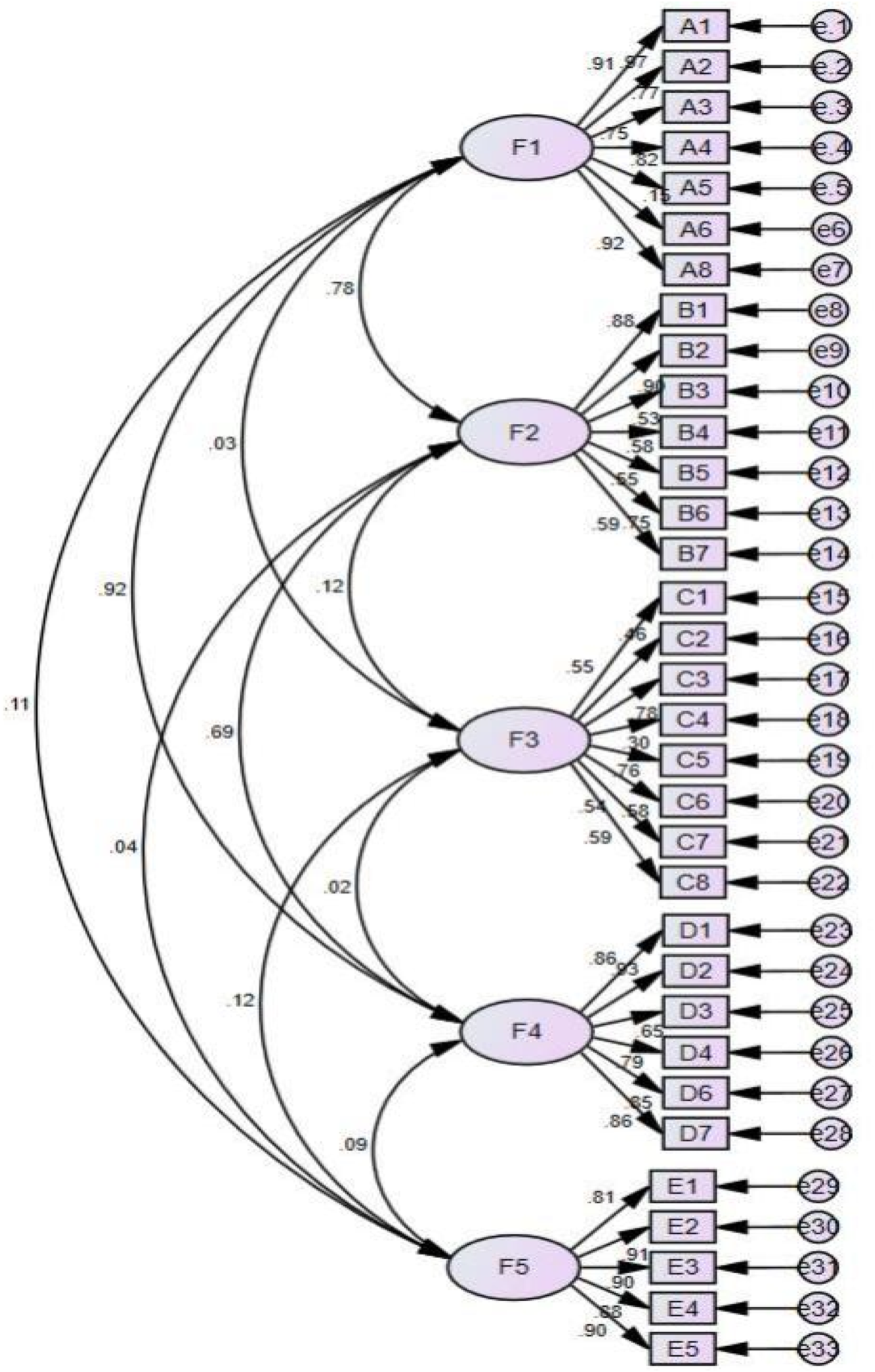 The item analysis revealed that the coefficient of variation for all items exceeded 0.15, while the critical ratio for the items varied from 1.93 to 46.85 (P < 0.05). The items-total correlation coefficients varied between 0.404 and 0.912 (P < 0.05), with the exception of item A7 (−0.812) and item D5 (0.281). The overall Cronbach's α coefficient for the scale was 0.909; however, the removal of items A7 and D5 would result in an increase in the coefficient. In the exploratory factor analysis, all items exhibited significant factor loadings between 0.415 and 0.915, with the exception of item A7 and item D5. Based on the results presented in Table 3, items A7 and D5 were excluded from the draft version, resulting in the development of a 33-item scale.