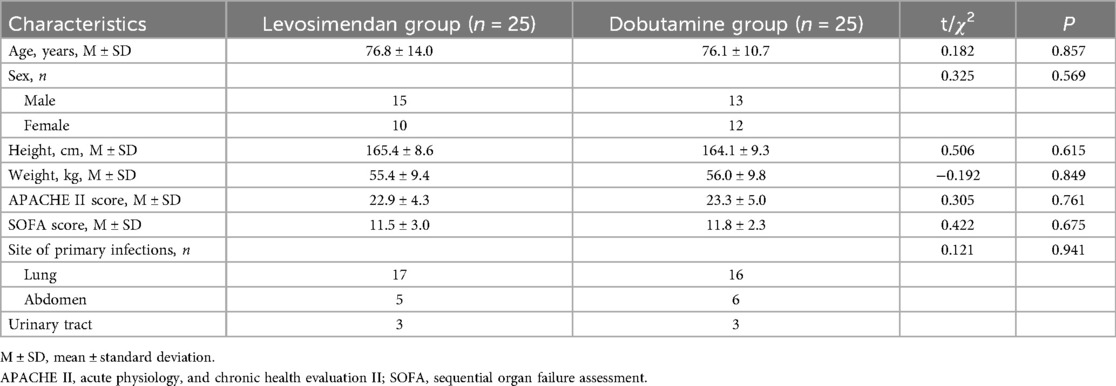 The participants were randomly assigned to either the levosimendan group or dobutamine group. All of them were treated following the standard sepsis guidelines, including antibiotics, fluid resuscitation, and supportive care, and were monitored by the pulse index continuous cardiac output (PiCCO). In the levosimendan group, levosimendan was initiated at 0.1 μg/kg/min and titrated to a range of 0.05–0.2 μg/kg/min to maintain the mean arterial pressure above 65 mmHg. The treatment was continued for 24 h. In the dobutamine group, dobutamine was initiated at 5 μg/kg/min and titrated within a range of 2.5–20 μg/kg/min to maintain mean arterial pressure (MAP) above 65 mmHg. Treatment was continued for 72 h.