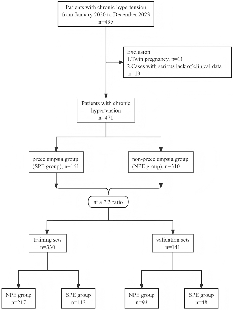 From January 2020 to December 2023, a total of 495 patients with CH were admitted to the Tongzhou Maternal and Child Health Care Hospital in Beijing. According to the inclusion and exclusion criteria, 24 cases (5.1% of screened patients) were excluded. In the end, a total of 471 patients with CH were included in this study and divided into two groups based on the presence or absence of PE: the superimposed PE group (SPE group, n = 161) and the non-PE group (NPE group, n = 310). The patients were randomly allocated into training and validation sets at a 7:3 ratio. The training set comprised 330 cases (NPE group: 217 cases [65.76%], SPE group: 113 cases [34.24%]), while the validation set consisted of 141 cases (NPE group: 93 cases [65.96%], SPE group: 48 cases [34.04%]) (Figure 1).