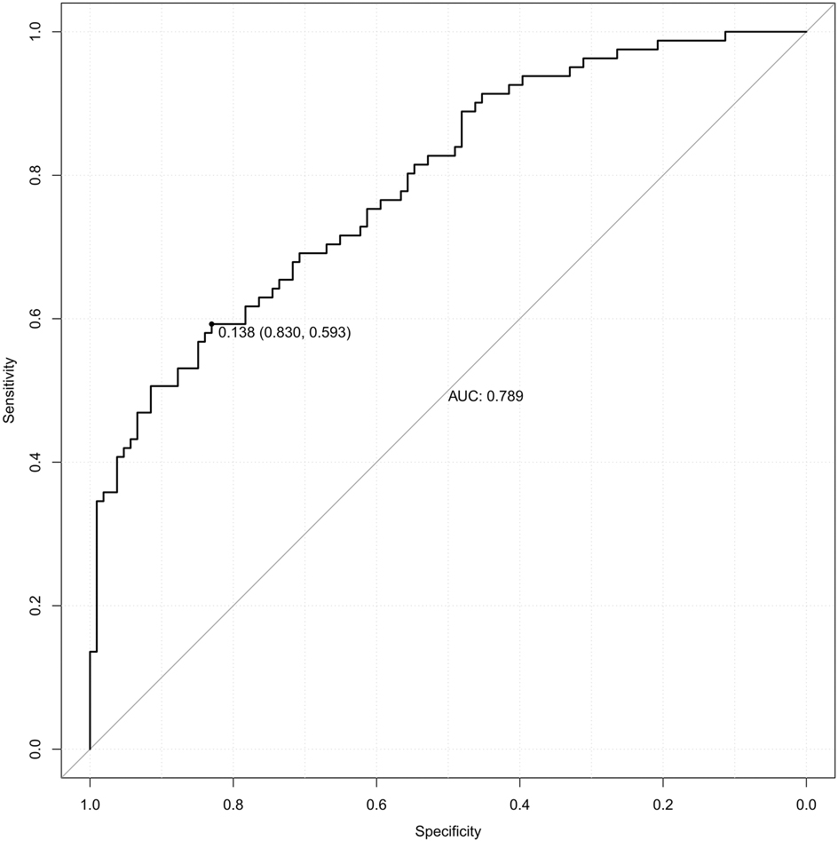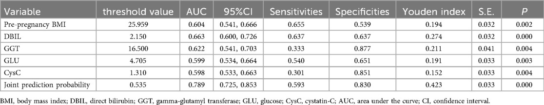 Table 5 presents the ROC analysis of predictive performance of pre-pregnancy BMI, DBIL, GGT, GLU, CysC, and the combined predictive value for PE. The results showed that the area under the curve of the combined diagnostic curve of DBIL, GGT, GLU, CysC and pre-pregnancy BMI was 0.789 (Figure 2), the sensitivity was 0.593, and the specificity was 0.830, which was the largest area under the curve of the combined diagnostic curve compared to that of a single index, and it had a good clinical predictive value.