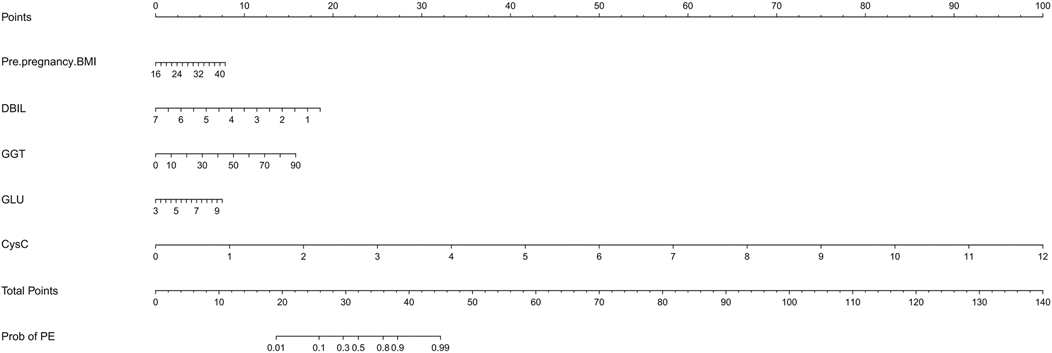 Conclusions: The occurrence of PE in women with CH is related to the peripheral blood levels of DBIL, GGT, GLU, CysC and pre-pregnancy BMI, and the combination of these indexes has a better clinical diagnostic value than a single index. The nomogram model constructed by using the above indicators can be used for the prediction of PE and has high predictive efficacy.