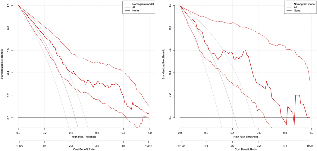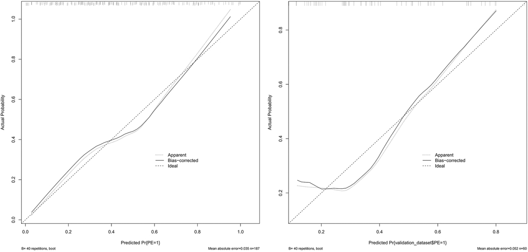 The DCA curve showed that the use of this model for predicting the development of PE would be beneficial when the probability of occurrence was between 0.28 and 0.78, see Figure 6. DCA, decision curve analysis.