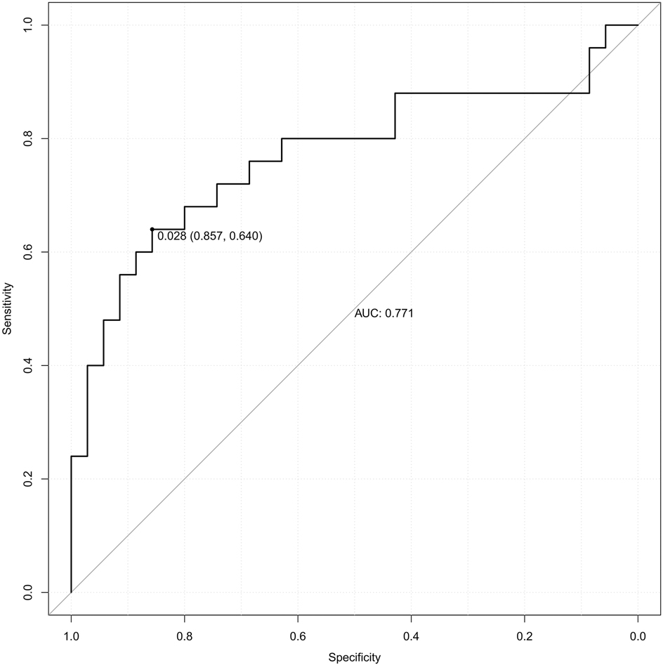 The model was subjected to 1,000 bootstrap resampling, and the C-index was 0.789. The calibration curve (solid line in Figure 4) fluctuated around the ideal curve (dashed line in Figure 4), indicating good predictive performance and reproducibility of the model. The prediction factors pre-pregnancy BMI, DBIL, GGT, GLU, CysC in the validation dataset were entered into the prediction model to calculate the predicted probability, and the ROC curve was plotted based on the predicted probability (Figure 5). The AUC was 0.771. The results indicate that the prediction model has good predictive ability when used in validation data and has good portability.
