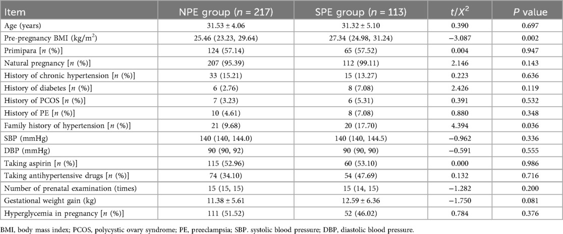 PE is a pregnancy-specific disease that can cause maternal and peripartum infant death. The study (9) found that the average gestational age when blood pressure starts to rise in PE patients is 32.54 weeks, and the average gestational age at pregnancy termination is 33.92 weeks. This indicates that PE progresses rapidly, with only 7–10 days from the onset of elevated blood pressure to uncontrollable disease and pregnancy termination. Doctors often use dexamethasone to promote fetal lung maturation, reducing neonatal mortality, a treatment that takes 36 h. Therefore, there is an urgent need for a predictive method for early PE detection in clinical practice to allow for early intervention and ensure maternal and infant safety. Currently, several markers are used in clinical practice for predicting PE, including maternal age, body weight, primiparity, family history, chronic diseases, and pre-pregnancy hypertension (6, 10). In addition, metabolic markers such as mean platelet volume, triglycerides, lactate dehydrogenase, blood urea nitrogen, and fasting blood glucose levels are also considered (11). However, none of these markers exhibit high specificity. Biomarkers and imaging indicators, such as the sFlt-1/PIGF ratio and uterine artery pulsatility index, are significant in the prediction of PE (12). However, the markers involved are complex, expensive, and not suitable for large-scale clinical screenings. CH with superimposed PE represents a more severe form of hypertensive disorders during pregnancy. Following the rise in the number of older pregnant women, there has been an annual increase in the incidence of CH among pregnant women. However, research on this topic remains limited. Therefore, our study integrates commonly used, cost-effective and easily accessible clinical indicators to predict the risk of PE in pregnant women with CH.