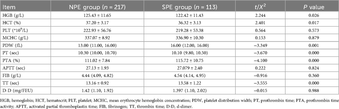 PE often causes damage to target organs, including the liver and kidneys. Our study revealed an inverse relationship between decreased DBIL levels and the risk of PE, with significantly lower DBIL levels in the SPE group compared to the NPE group (P < 0.05). Bilirubin is typically regarded as a deleterious compound to the human body, it is predominantly utilized in clinical contexts to facilitate the diagnosis of hemolytic and hepatic disorders. However, recent studies have increasingly confirmed bilirubin's antioxidant capabilities (13), suggesting that low bilirubin levels elevate the risk of PE, potentially through several mechanisms: its antioxidant properties neutralize oxygen free radicals, thereby safeguarding vascular endothelial cells from oxidative stress-induced damage; it inhibits the formation of oxidized low-density lipoprotein, thereby preventing vascular inflammatory injury (14); and it suppresses the oxidation of low-density lipoprotein cholesterol, thereby maintaining redox balance and mitigating vascular endothelial damage (15). Our study revealed that the DBIL levels were significantly lower in the SPE group as compared to the NPE group. Despite being a prevalent laboratory indicator, DBIL is frequently disregarded by clinicians. Our study highlights the importance of DBIL in the early prediction of PE. Further foundational research is needed to explore and validate the underlying mechanisms.