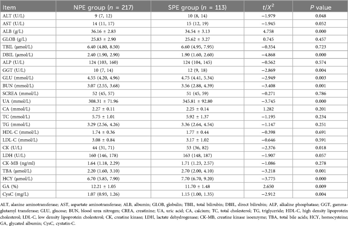 PE, preeclampsia; SPE, superimposed preeclampsia; NPE, non-preeclampsia; CH, chronic hypertension; DBIL, direct bilirubin; GGT, gamma-glutamyl transferase; GLU, glucose; CysC, cystatin-C; BMI, body mass index; PCOS, polycystic ovary syndrome; GDM, gestational diabetes mellitus; SBP, systolic blood pressure; DBP, diastolic blood pressure; HGB, hemoglobin; HCT, hematocrit; PLT, platelet; MCHC, mean erythrocyte hemoglobin concentration; PDW, platelet distribution width; PT, prothrombin time; PTA, prothrombin time activity; APTT, activated partial thromboplastin time; FIB, fibrinogen; TT, thrombin time; D-D, d-dimer; ALT, alanine aminotransferase; AST, aspartate aminotransferase; ALB, albumin; GLOB, globulin; TBIL, total bilirubin; ALP, alkaline phosphatase; BUN, blood urea nitrogen; CREA, creatinine; UA, uric acid; CA, calcium; TC, total cholesterol; TG, triglyceride; HDL-C, high density lipoprotein cholesterol; LDL-C, low density lipoprotein cholesterol; CK, creatine kinase; LDH, lactate dehydrogenase; CK-MB, creatine kinase isoenzyme; TBA, total bile acids; HCY, homocysteine; GA, glycated albumin.