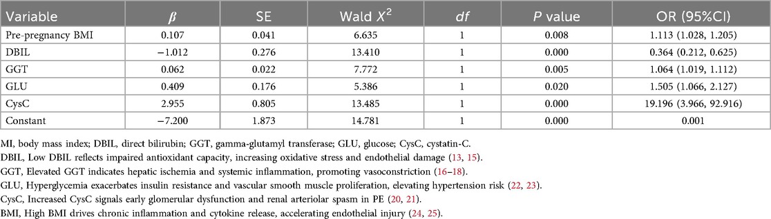 The kidney is one of the main organs affected by PE. Our study suggest that elevated CysC (OR = 19.196) strongly indicates renal impairment, possibly due to decreased glomerular filtration rate and PE-related renal arteriolar spasm. PE patients exhibit significant continuous functional and structural changes in the kidneys, and the elevation of CysC may result from increased immune function and nucleated cell count in the body (21), aligning with Wen's proposal that CysC serves as an early predictive biomarker for PE (22). Regarding renal function indicators, most clinicians focus on uric acid, creatinine, and blood urea nitrogen, often overlooking CysC. Our results demonstrate that CysC can predict PE, suggesting that doctor should pay more attention to it in clinical practice. Although CysC demonstrated a strong association with PE (OR = 19.196), the wide confidence interval suggests variability in its effect size. This may reflect biological heterogeneity or sample size limitations, warranting cautious interpretation until validated in larger studies.