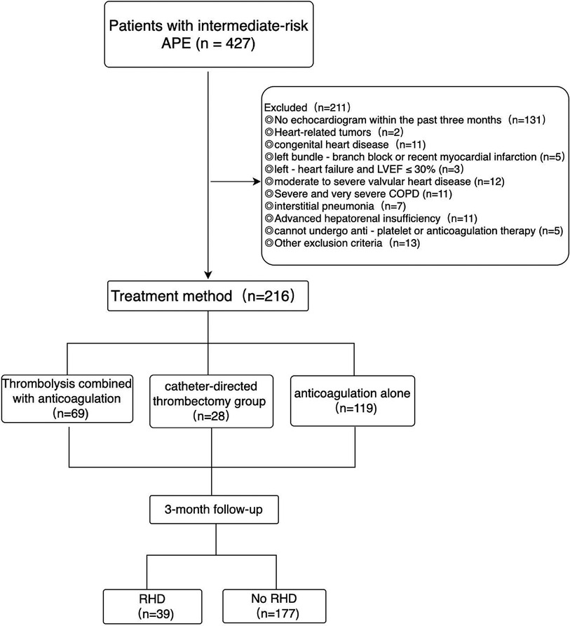 A total of 216 patients who were diagnosed with APE in the intermediate - risk group and had complete clinical data were retrospectively enrolled. These patients were hospitalized in the Department of Cardiology at the First Hospital of Jilin University from August 2018 to April 2024. Among them, 69 patients received thrombolysis combined with anticoagulation therapy, 28 patients underwent catheter-directed thrombectomy combined with anticoagulation therapy, and 119 patients were treated with anticoagulation therapy alone, the patients were followed up for at least 3 months, with a median follow - up time of 4.2 months (Figure 1). This study was conducted in strict accordance with the revised Declaration of Helsinki. The research protocol was meticulously reviewed and approved by the Ethics Committee of the First Hospital of Jilin University (Ethics Approval Number: 2025 - 048). Moreover, written informed consent was obtained from all patients, ensuring that they were fully aware of the study details and voluntarily participated in the research. In this study, the diagnosis of APE in the intermediate - risk group should first meet the diagnostic criteria and risk stratification standards outlined in the 2019 ESC Guidelines for the diagnosis and management of APE. In addition, patients were excluded according to the following criteria: patients with contraindications for pulmonary artery catheterization, such as prostheses or vegetations of the tricuspid or pulmonary valves, left bundle - branch block, or recent myocardial infarction; patients with a history of left - heart failure and a left ventricular ejection fraction (LVEF) ≤30%; patients with congenital heart disease, moderate to severe valvular heart disease, cardiomyopathy, cardiac amyloidosis, fabry disease, or constrictive pericarditis; Severe and very severe chronic obstructive pulmonary disease (COPD, with FEV₁/FVC still <70% and FEV₁ percentage of the predicted value <50%), interstitial pneumonia, or active pulmonary tuberculosis; patients with preoperative renal function test results indicating serum creatinine >1.8 mg/dl or 159 μmol/L; preoperative liver function score indicates: Child - Pugh class C; patients who cannot undergo anti - platelet or anticoagulation therapy (Platelets <50 × 109/L or INR >3); patients who have undergone open cardiovascular or pulmonary surgery within 7 days before the operation; Heart-related tumors, systemic infectious diseases, sepsis, the patient's general condition not being able to tolerate surgery, and the expected lifespan being less than 3 months; pregnant and lactating women; patients who are participating in other drug or medical device clinical trials and those with incomplete clinical data.