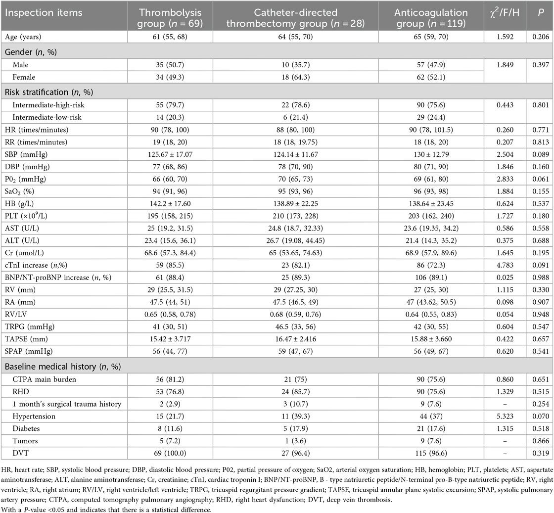 In the general data, there were 69 patients in the thrombolysis group. The median age was 61 years (IQR 55–68), with 35 (50.7%) being male patients and 55 (79.7%) classified as intermediate-high-risk APE. In the catheter-directed thrombectomy group, there were 28 patients. The median age was 64 years (IQR 55–70), including 10 (35.7%) male patients and 22 (77.6%) intermediate-high-risk APE. In the anticoagulation group, there were 119 patients. The median age was 65 years (IQR 59–70), with 57 (47.9%) male patients and 90 (75.6%) intermediate-high-risk APE (Table 1). There were no statistically significant differences in age, gender, risk stratification, heart rate (HR), respiratory rate (RR), systolic blood pressure (SBP), diastolic blood pressure (DBP), partial pressure of oxygen (PO2), oxygen saturation (SaO₂), hemoglobin (HB), platelet count (PLT), aspartate aminotransferase (AST), alanine aminotransferase (ALT), creatinine (Cr), RV, RA, RV/LV, TRPG, TAPSE, SPAP, presence of elevated cardiac troponin I (cTnI), presence of elevated B - type natriuretic peptide/N-terminal pro-B-type natriuretic peptide (BNP/NT-proBNP), involvement of the main trunk on CTPA, presence of cardiac dysfunction, history of surgery or trauma within 1 month, comorbidity of hypertension, diabetes, tumor, or deep vein thrombosis (DVT) among the three treatment modalities (P > 0.05) (Table 1).
