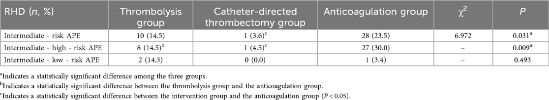 Acute pulmonary embolism (APE) is a disease with high incidence and high mortality. It is the third leading cause of death among cardiovascular diseases after myocardial infarction and stroke (1–3). Epidemiological studies in Western countries have shown that the annual incidence of APE in the general population is approximately 39–115 per 100,000 (2). According to the 2019 ESC Guidelines for the diagnosis and management of APE (2), defining intermediate - risk pulmonary embolism (PE) poses a serious challenge. Although patients with intermediate - risk APE have stable hemodynamics, at least one of the cardiac biomarkers and right ventricular dysfunction is abnormal, and both are independently associated with an increased risk of mortality. According to the latest domestic and international guidelines (1, 2), direct thrombolysis is not recommended for patients with intermediate - risk APE. Only when there is hemodynamic impairment, rescue thrombolysis can be performed. If there are contraindications to thrombolysis, surgical thrombectomy or catheter - based interventional therapy can be used as an alternative to rescue thrombolysis. Anticoagulation therapy is the fundamental treatment for APE. Reperfusion treatment, including pharmacological thrombolysis and interventional therapy, can rapidly reduce the cardiac load and relieve hemodynamic pressure. The benefits of pulmonary reperfusion treatment in intermediate - risk APE remain unclear, and the results of multiple randomized trials vary. In this study, we compared the incidence of RHD among intermediate - risk APE patients who received different treatment strategies after 3 months, aiming to evaluate the impact of reperfusion treatment on right heart function during the follow - up period in patients with intermediate - risk APE.