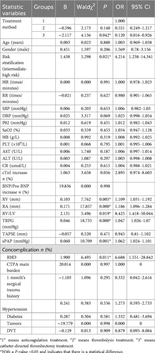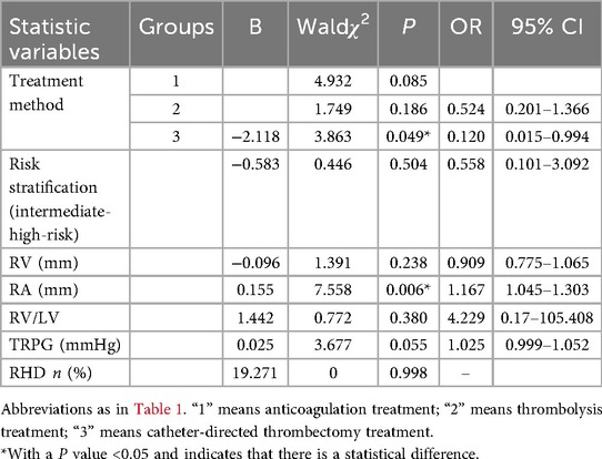 In this study, univariate logistic regression analysis was employed to investigate the influencing factors of RHD during the follow - up period among patients with APE in the intermediate - risk group. Subsequently, the indicators with a P - value less than 0.05 in the univariate analysis and those with clinical significance were included in the multivariate logistic regression analysis. Univariate logistic regression analysis revealed thatcatheter-directed thrombectomy approaches reduced the likelihood of RV dysfunction at 3 months by 8.3 amount (OR = 0.120, 95% CI: 0.016–0.926, P = 0.042). Meanwhile, univariate logistic regression analysis indicated that hazard stratification, baseline RHD, RV, RA, RV/LV, TRPG, and SPAP were all correlated with the occurrence of RHD after 3 months (P < 0.05) (Table 3). Since there was a linear correlation between TRPG and SPAP, only TRPG was included in the multivariate logistic regression analysis. The multivariate logistic regression analysis indicated that Catheter-directed thrombectomy reduced the probability of RHD at 3 months to 0.12 of that with anticoagulation therapy alone (OR = 0.120, 95% CI: 0.015–0.994, P = 0.049). RA value was an independent risk factor for the development of RHD after 3 months (OR = 1.167, 95% CI: 1.045–1.303, P = 0.006) (Table 4).