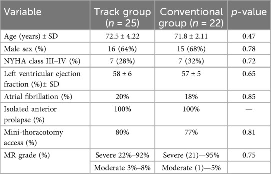Baseline characteristics were comparable between the two groups (Table 1). The mean patient age was 72.5 ± 4.2 years in the track group and 71.8 ± 3.9 years in the conventional group. All patients presented with isolated anterior leaflet prolapse or flail and underwent surgery through right mini-thoracotomy access in the majority of cases (80% track vs. 77% conventional, p = 0.81). No patients required conversion to valve replacement, and all received a complete annuloplasty ring without any additional surgical techniques.