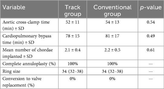 Intraoperatively, the number of chordae implanted was similar between groups (2.1 ± 0.4 vs. 2.2 ± 0.5, p = 0.61). Aortic cross-clamp and cardiopulmonary bypass times did not differ significantly, indicating procedural feasibility of the track technique (Table 2).