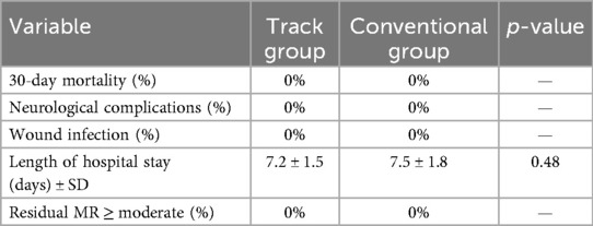 Postoperative outcomes were excellent in both groups, with zero 30-day mortality or major complications such as stroke or wound infections (Table 3). Length of hospital stay averaged 7.2 ± 1.5 days in the track group and 7.5 ± 1.8 days in the conventional group (p = 0.48).