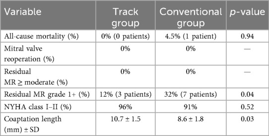 Coaptation length is a validated surrogate marker of repair durability (17). Insufficient leaflet coaptation is associated with early MR recurrence and suboptimal leaflet competence, particularly in anterior leaflet disease. Our findings reinforce this link: patients treated with the track technique achieved a mean coaptation length of 10.7 ± 1.5 mm, exceeding that of the conventional group and aligning with biomechanical thresholds previously associated with long-term competence. Furthermore, the narrower standard deviation in the track group (1.5 mm vs. 1.8 mm) indicates enhanced reproducibility and reduced inter-operator variability—critical goals in modern cardiac surgery. This consistency may translate into better long-term durability and fewer late reinterventions, although longer follow-up is needed.