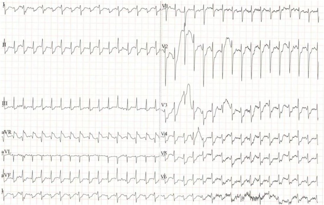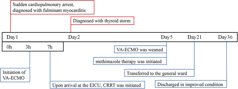 A 47-year-old female with a history of hyperthyroidism, on regular medication but without routine thyroid hormone monitoring, denied any history of hypertension, diabetes, or heart disease. She presented with “Fatigue for 2 weeks since COVID-19 diagnosis” at a local hospital, two weeks prior, she had contracted COVID-19, after which she experienced persistent fatigue and recent diarrhea. Initial evaluation at the local hospital showed no significant abnormalities in cardiac enzymes or electrocardiogram (ECG). During the hospitalization, the patient suddenly developed respiratory and CA. Immediate endotracheal intubation and continuous cardiopulmonary resuscitation (CPR) were initiated. CPR was unsuccessful, and the patient did not return of spontaneous circulation after 30 min of advanced life support. The physicians at the local hospital held a conference with the family, who expressed their desire for continued aggressive resuscitation efforts. Consequently, the local medical team contacted our institution to request assistance from our extracorporeal membrane oxygenation (ECMO) team. The ECMO circuit was successfully established 3 h after the onset of CA. The patient was subsequently transferred to the emergency intensive care unit (EICU) at our institution 7 h post-arrest.