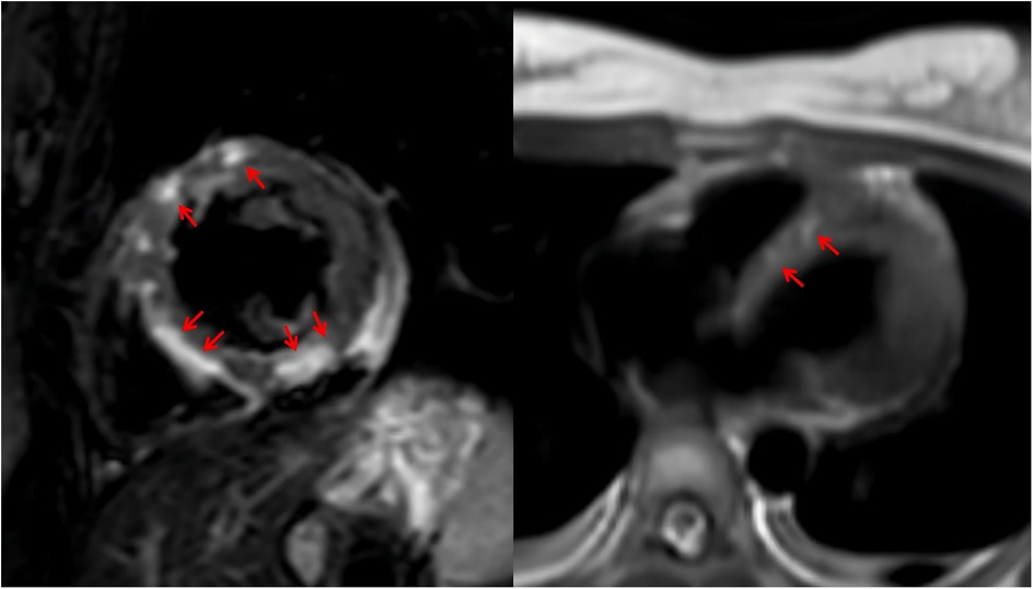 Given the onset of AKI, CRRT was initiated immediately upon the patient's arrival in the emergency intensive care unit (EICU) to manage fluid overload, correct severe metabolic acidosis, and remove inflammatory mediators. The CRRT modality selected was continuous venovenous hemofiltration (CVVH). Upon admission, continuous cardiac monitoring revealed frequent episodes of supraventricular tachycardia. After hemodynamic stabilization, a low-dose esmolol infusion was administered to control the heart rate. Initial thyroid function tests showed the following results: triiodothyronine (T3) 5.49 ng/ml, free triiodothyronine (FT3) >20.00 pg/ml, thyroxine (T4) 15.78 μg/dl, free thyroxine (FT4) >5.00 ng/dl, and thyroid-stimulating hormone (TSH) 0.070 μIU/ml. The patient exhibited elevated FT3 and FT4 levels, based on both the Japan Thyroid Association (JTA) guidelines for the management of thyroid storm and the Burch-Wartofsky Point Scale (65 points), these findings are consistent with a diagnosis of TS (7). A review of the relevant literature indicated that CRRT could be utilized in the acute phase management of TS (8). The CRRT modality was not adjusted. Consequently, the decision was made to continue CRRT, with its efficacy being assessed through serial monitoring of thyroid hormone levels. By day 3, thyroid hormone levels significantly decreased (Table 1). By day 5, LVEF improved to 57%, and no ventricular arrhythmias were observed. Unfortunately, both the ultrasonography and ECG were performed at the bedside using mobile devices. Due to a routine memory update of the equipment, the corresponding imaging data were not saved. VA-ECMO was successfully weaned. By day 6, methimazole was added to manage hyperthyroidism. After 3 weeks of treatment, the patient was successfully transferred to the general ward and underwent cardiac MRI, which revealed multifocal myocardial edema involving the left ventricular interventricular septum, anterior wall, and inferior wall (Figure 2). After 36 days of systematic treatment, the patient was successfully discharged with complete renal function recovery (no longer requiring renal replacement therapy) and satisfactory neurological recovery, demonstrating full independence in daily activities and achieving an optimal clinical outcome. Figure 3 is a timeline of the clinical condition progress and major management of the patient.