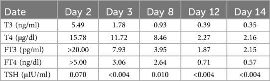 According to clinical guidelines, the management of TS includes treating the underlying cause, inhibiting thyroid hormone synthesis and release, and controlling heart rate (4). For this patient, rapidly mitigating the adverse effects of thyroid hormones on the heart was a key therapeutic priority. Initially, CRRT was selected to address severe acidosis secondary to prolonged CPR and concurrent kidney dysfunction. Upon confirming TS, literature review revealed evidence supporting CRRT's efficacy in reducing serum T3 and T4 levels in TS patients (8). Consequently, CRRT was continued. By day 3 of hospitalization, the patient's T3 and T4 levels had significantly decreased, demonstrating the effectiveness of CRRT in lowering thyroid hormone levels. However, the patient initially experienced recurrent supraventricular tachycardia. Following hemodynamic stabilization, esmolol and propranolol were sequentially administered to control heart rate. By day 5, no further ventricular arrhythmias were observed. Liver function improved, and methimazole was added on day 6 to manage hyperthyroidism, with subsequent dose adjustments to pre-illness levels, resulting in well-controlled disease progression.