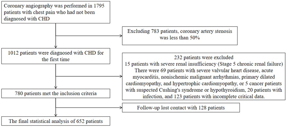 This study enrolled patients who underwent coronary angiography at the First Hospital of Hebei Medical University between August 1, 2018, and March 30, 2020. Eligible participants were newly diagnosed with coronary artery disease (CAD) and had not received prior treatment. All participants provided informed consent for the anonymous use of their clinical data. Exclusion criteria were: angiographic stenosis <50%, confirmed infectious disease, stage 5 chronic kidney disease, heart failure, non-ischemic cardiac conditions (e.g., severe valvular disease, acute myocarditis, malignant arrhythmias of non-ischemic origin, primary dilated cardiomyopathy, hypertrophic cardiomyopathy), suspected malignancy, Conn's syndrome, Cushing's syndrome, hypothyroidism, and incomplete clinical data. These criteria were applied to ensure a homogeneous cohort and to minimize confounding factors affecting inflammatory markers or cardiovascular outcomes. This study was approved by the Ethics Committee of the First Hospital of Hebei Medical University (ethical approval number: 20220362), and conducted in line with the Declaration of Helsinki.