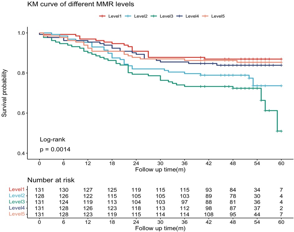 Figure 2. The Kaplan–Meier curves. The MMR was ranked from low to high, and the sample population was divided into five groups by quintile interval.