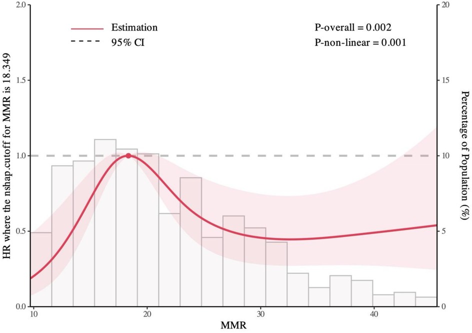 Results: Patients were stratified into quintiles based on MMR values (L1: 7.89–14.43; L2: 14.50–17.96; L3: 18.00–22.16; L4: 22.25–28.53; L5: 28.67–60.67). Kaplan–Meier analysis revealed significantly poorer outcomes in the L3 group compared with other quintiles (log-rank P = 0.0014). RCS analysis demonstrated a significant nonlinear association between MMR levels and MACE risk (P = 0.001), characterized by an inverted U-shaped relationship. Incorporating MMR into conventional risk models significantly improved predictive performance (AUC 0.718 vs. 0.673; P = 0.018).