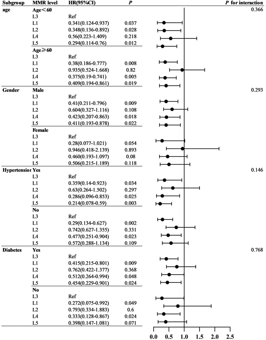 Subgroup analyses by age, sex, diabetes, and hypertension status revealed consistent associations, with no significant interaction effects. Although some subgroup estimates did not reach statistical significance, the directionality was consistent with the overall findings. These results suggest the robustness of MMR as a prognostic marker, though larger cohorts are needed to confirm subgroup-specific effects (37).