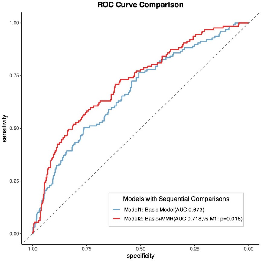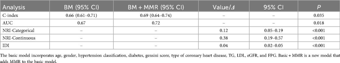 The addition of MMR quintiles to conventional cardiovascular risk models significantly improved prognostic performance. The baseline model, which included age, sex, hypertension grade, diabetes mellitus, CAD type, Gensini score, triglycerides, LDL-C, eGFR, and fasting plasma glucose, yielded a C-index of 0.657 and an AUC of 0.673. After incorporating MMR, the C-index increased to 0.691 (P = 0.035) and the AUC improved to 0.718 (P = 0.018). Moreover, both net reclassification improvement (NRI) and integrated discrimination improvement (IDI) were significantly enhanced (P < 0.001 for both; Figure 5 and Table 4).