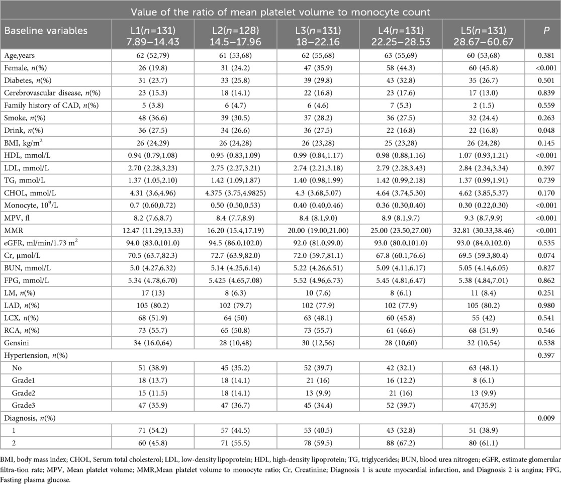 A total of 652 patients were enrolled, including 222 women (34.0%), with a mean age of 60.8 years. Among them, 377 (57.8%) presented with angina pectoris, 181 (27.3%) had diabetes mellitus, and 399 (60.0%) had hypertension. The mean MMR was 21.8. Patients were stratified into quintiles by MMR values: L1 (n = 131; 7.89–14.43), L2 (n = 128; 14.50–17.96), L3 (n = 131; 18.00–22.16), L4 (n = 131; 22.25–28.53), and L5 (n = 131; 28.67–60.67). Significant differences in several clinical variables were observed across quintiles, whereas age, creatinine, blood urea nitrogen, body mass index, estimated glomerular filtration rate, and cholesterol levels showed no significant variation (Table 1).