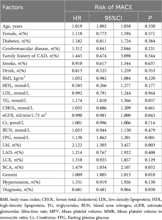 AUC, area under the receiver operating characteristic curve; BMI, body mass index; CABG, coronary artery bypass grafting; CAD, coronary artery disease; CCS, chronic coronary syndrome; CI, confidence interval; HDL-C, high-density lipoprotein cholesterol; HR, hazard ratio; IDI, integrated discrimination improvement; LDL-C, low-density lipoprotein cholesterol; MACE, major adverse cardiovascular events; NRI, net reclassification improvement; PCI, percutaneous coronary intervention; ROC, receiver operating characteristic; SD, standard deviation; TC, total cholesterol; TG, triglycerides; MPV, mean platelet volume; MMR, the ratio of mean platelet volume to the number of monocytes; Cr, creatinine; BUN, blood urea nitrogen; eGFR, estimated glomerular filtration rate; AMI, acute myocardial infarction; FPG, fasting plasma glucose; RCS, restricted cubic spline.
