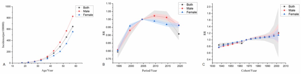 Figure 3. Age-Period-Cohort analysis model of incidence. (A) is the age effect, (B) is the period effect, (C) is the cohort effect.