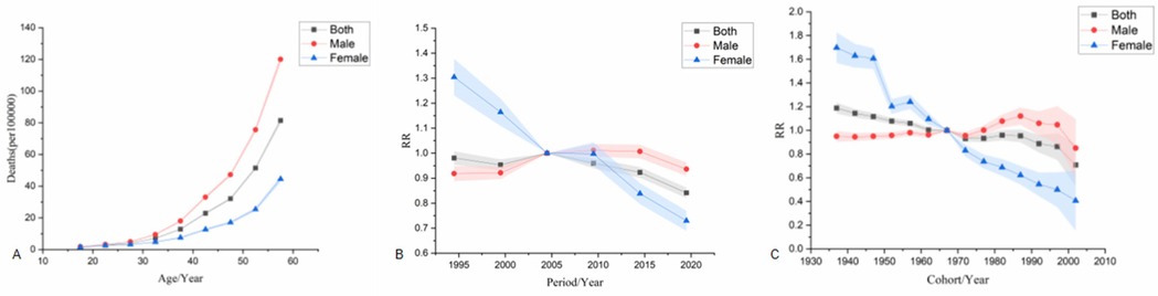 Figure 4. Age-Period-Cohort analysis model for death. (A) is the age effect, (B) is the period effect, (C) is the cohort effect.