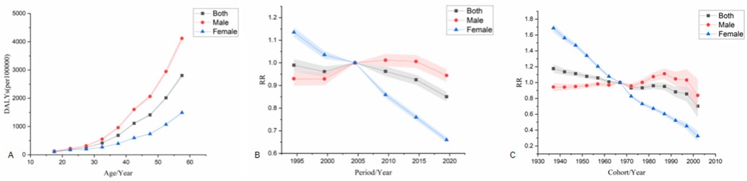 Figure 5. Age-Period-Cohort analysis model for DALYs. (A) is the age effect, (B) is the period effect, (C) is the cohort effect.