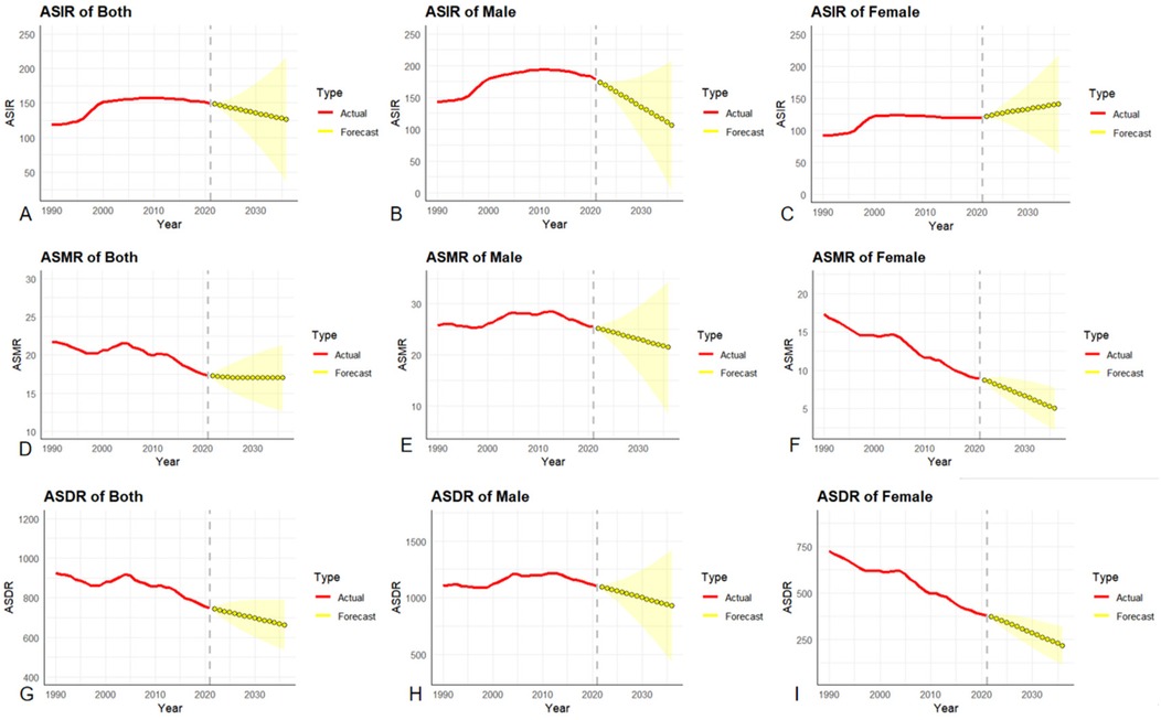 The ASIR among the Chinese working population is on the decline, decreasing from 149.42/100,000 in 2021–125.72/100,000 in 2036, with an overall decline rate of 15.86%. After conducting a gender stratification analysis of the prediction results, we found that there are fundamental differences in the ASIR change trends between men and women. The male population is on a downward trend, dropping from 178.18/100,000 in 2021–105.88/100,000 in 2036, representing a decline of 40.58%. In sharp contrast, the ASIR of the female population rose from 119.86/100,000 in 2021–140.64/100,000 in 2036, representing a growth of 17.34% see Figure 6.