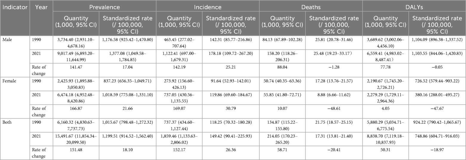 In 2021, the number of deaths from ischemic heart disease among people aged 15–59 in China was 214.05 thousand, and the standardized mortality rate was 17.31 per 100,000. Compared with the number of deaths in 1990, it increased by 58.71%, and the mortality rate decreased by 20.41%. From the perspective of gender differences, the number of deaths and standardized mortality rates of men in each year were higher than those of women. In terms of DALYs, the number of disabled adjusted cases in 2021 was 8,838.70 thousand, and the standardized DALYs rate was 748.86 per 100,000, an increase of 50.31% compared with the number of disabled adjusted cases in 1990, while the standardized DALYs rate decreased by 18.97%. Among them, the number of disabled people and the standardized DALYs rate of males in each year were both higher than those of females. In terms of the patient population, the number of patients in 2021 was 15,491.67 thousand, and the standardized prevalence rate was 1,199.51 per 100,000, increasing by 151.48% and 18.10% respectively compared with 1990. Among them, the number of patients and the standardized prevalence rate of men in each year were both higher than those of women. In terms of the affected population, the number of cases in 2021 was 1,859.46 thousand, and the standardized incidence rate was 149.42 per 100,000, increasing by 152.17% and 26.36% respectively compared with 1990. Among them, the number of cases and standardized incidence rates of men in each year were both higher than those of women see Table 1.