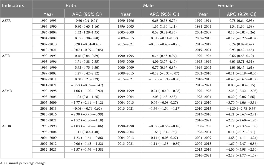 From 1990–2021, the ASPR of ischemic heart disease among Chinese adults aged 15–59 rose significantly, with an AAPC of 0.53 (95% CI: 0.49–0.57). Segmented analysis revealed a modest decline from 2010–2021 (APC = −0.07, 95% CI: −0.09 to −0.05), whereas all earlier intervals displayed an upward trajectory, most steeply between 1996 and 2004 (APC = 1.32, 95% CI: 1.29–1.35). When stratified by sex, both men and women experienced sustained increases; however, the pace among women exceeded that among men (AAPC 0.62 vs. 0.53) see Tables 2, 3 and Figure 2.
