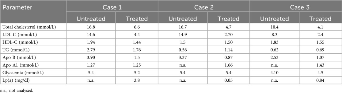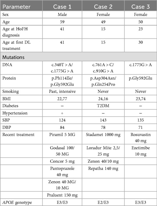 We present three clinically distinct cases of HoFH to highlight the phenotypic heterogeneity among these individuals. Patient characteristics and current pharmacological treatments are summarized in Table 1. Pathogenic variants in the LDLR gene were confirmed through targeted next-generation sequencing, which revealed two compound heterozygotes and one true homozygote. The common Czech APOB variant (p.Arg3527Gln) (8, 9) was excluded in all the cases. Importantly, in all three cases, HoFH was diagnosed incidentally during examinations for unrelated health issues. HoFH was primarily diagnosed by using clinical Duth Lipid Clinic Network criteria for Familial Hypercholesterolemia (10). Subsequently, genetic testing was introduced.