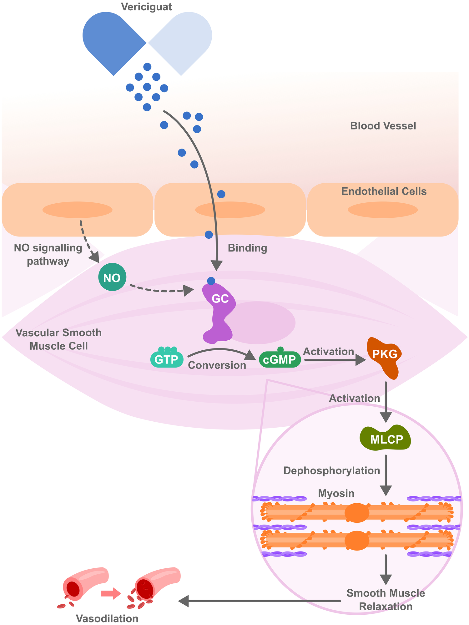 Vericiguat molecular mechanism of action. It acts by stimulating guanylate cyclase (sGC), both independently and in synergy with nitric oxide (NO) thereby activating cyclic guanosine monophosphate (cGMP) and further activating protein kinase G (PKG). PKG then activates myosin light chain phosphatase (MLCP), triggering a signaling cascade that leads to muscle relaxation and vasodilation, ultimately improving blood flow and reducing cardiac workload.
