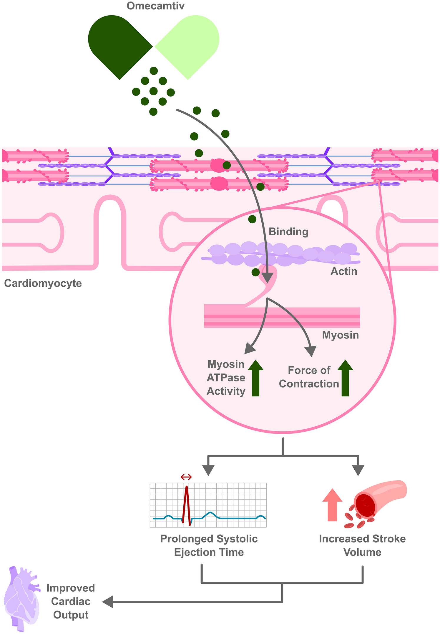 Omecamtiv Mecarbil enhances heart function by binding to myosin increasing actin–myosin interaction without raising intracellular calcium. This leads to prolonged systolic ejection time and increased stroke volume, leading to improved cardiac output.