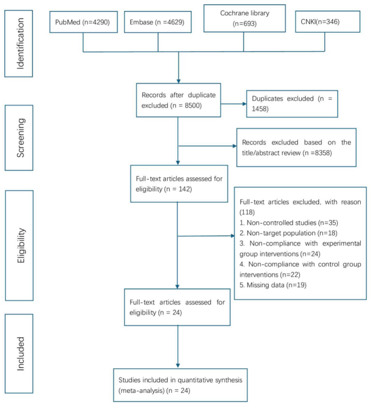 The initial database search yielded 9,958 records. After importing into EndNote X8 for duplicate removal, 1,458 records were excluded, leaving 8,500 unique studies. Title and abstract screening eliminated 8,358 irrelevant papers, and 142 articles underwent full-text review. Of these, 118 were excluded for failing to meet inclusion criteria—most commonly due to non-controlled design, non-target populations, inconsistent interventions, or incomplete data. Ultimately, 24 studies met the eligibility criteria and were included in the meta-analysis. The study selection process conformed to PRISMA guidelines, with detailed steps illustrated in Figure 1.