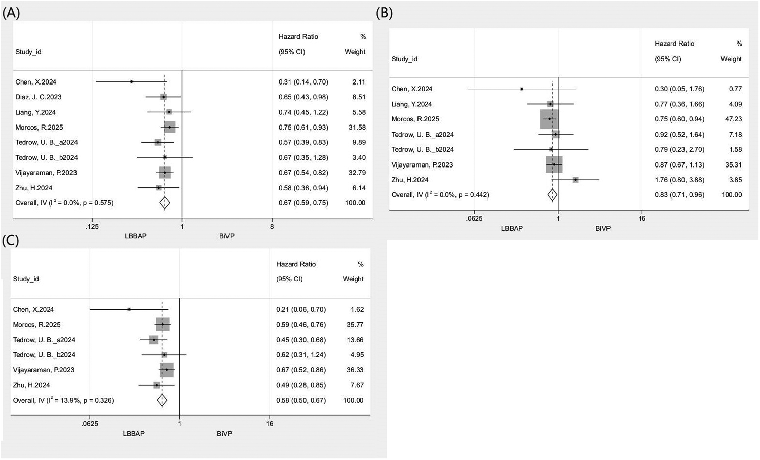 Forest plot comparing clinical outcomes between LBBAP and BiVP. (A) All-cause mortality or HFH; (B) All-cause mortality; (C) HFH.