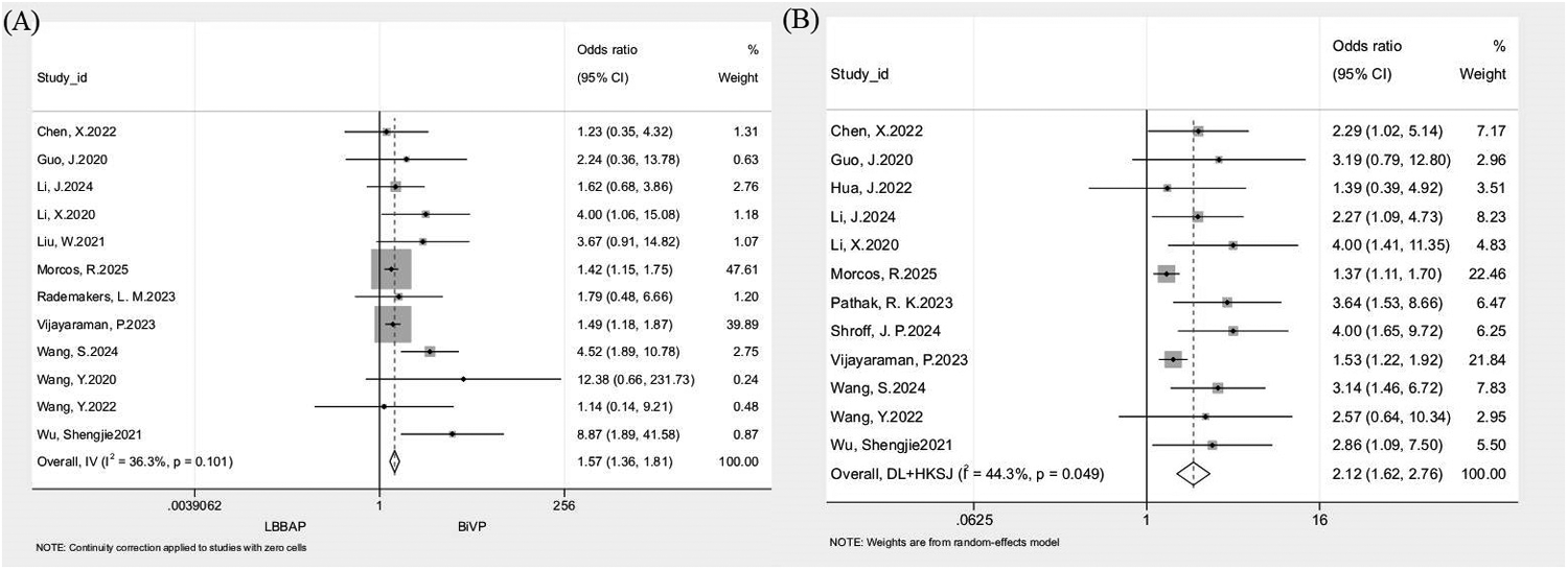 Left bundle branch area pacing (LBBAP) has emerged as a physiological pacing strategy that achieves ventricular resynchronization through direct activation of the His–Purkinje network. By circumventing the non-physiological myocardial stimulation inherent to epicardial pacing, LBBAP represents a promising alternative to conventional BiVP (7). Several studies have shown that LBBAP yields higher procedural success rates than BiVP (8) and more effectively narrows QRS duration and improves ventricular remodeling parameters (9). Moreover, LBBAP is often associated with shorter procedural and fluoroscopy times (10, 11). Nevertheless, the evidence remains heterogeneous; certain registries report no significant procedural advantage, likely reflecting variations in operator experience and the procedural learning curve. Although LBBAP demonstrates superior electrophysiological and remodeling outcomes, evidence regarding hard clinical endpoints such as all-cause mortality and heart failure hospitalization (HFH) remains inconsistent. Parlavecchio et al. reported a ∼40% reduction in HFH with LBBAP compared with BiVP, though no difference in mortality was observed (9). Similarly, Jin et al. found that LBBAP reduced HFH but did not significantly affect all-cause mortality (11). In contrast, Leventopoulos et al. (12) reported reductions in both mortality and HFH with LBBAP; however, these results were largely driven by the study from Vijayaraman et al. (13), as significance was lost after its exclusion. Such discrepancies likely stem from limited follow-up durations and small sample sizes.