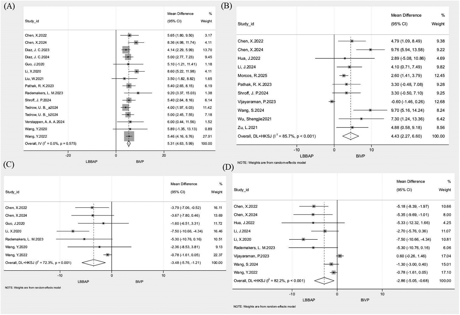 LBBAP was associated with a markedly lower risk compared to BiVP across several clinical outcomes. Specifically, it significantly reduced the risk of the composite endpoint (HR: 0.67, 95% CI: 0.59–0.75), all-cause mortality (HR: 0.83, 95% CI: 0.71–0.96), and HFH (HR: 0.58, 95% CI: 0.50–0.67). Echocardiographic outcomes further supported LBBAP superiority, with higher rates of echocardiographic response (OR: 1.57, 95% CI: 1.36–1.81) and super-response (OR: 2.12, 95% CI: 1.62–2.76). Improvements in left ventricular ejection fraction (LVEF) were greater with LBBAP at both 3–6 months (MD: 5.31%, 95% CI: 4.63–5.99) and ≥12 months (MD: 4.43%, 95% CI: 2.27–6.60). Similarly, left ventricular end-diastolic diameter (LVEDD) reductions were more pronounced at 3–6 months (MD: −3.48 mm, 95% CI: −5.76 to −1.21) and ≥12 months (MD: −2.86 mm, 95% CI: −5.05 to −0.68).
