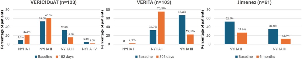 Figure 2. Changes in NYHA functional class after treatment with vericiguat. NYHA, New York heart association. Figure based on data from references (20, 22, 23).
