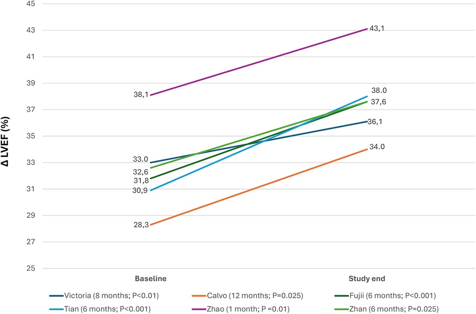 Figure 4. Changes in left ventricular ejection fraction after treatment with vericiguat. ΔLVEF, change in left ventricular ejection fraction from baseline to study end, (follow-up; P value study end-baseline). Figure based on data from references (18, 19, 28, 32, 33, 36).