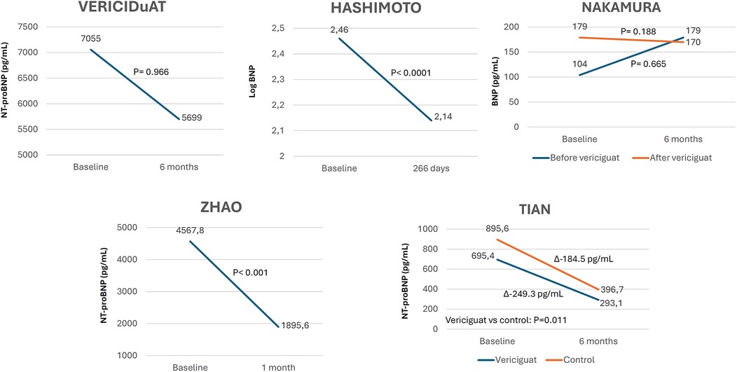 Figure 5. Changes in natriuretic peptides levels after treatment with vericiguat. Figure based on data from references (22, 29, 30, 32, 33).