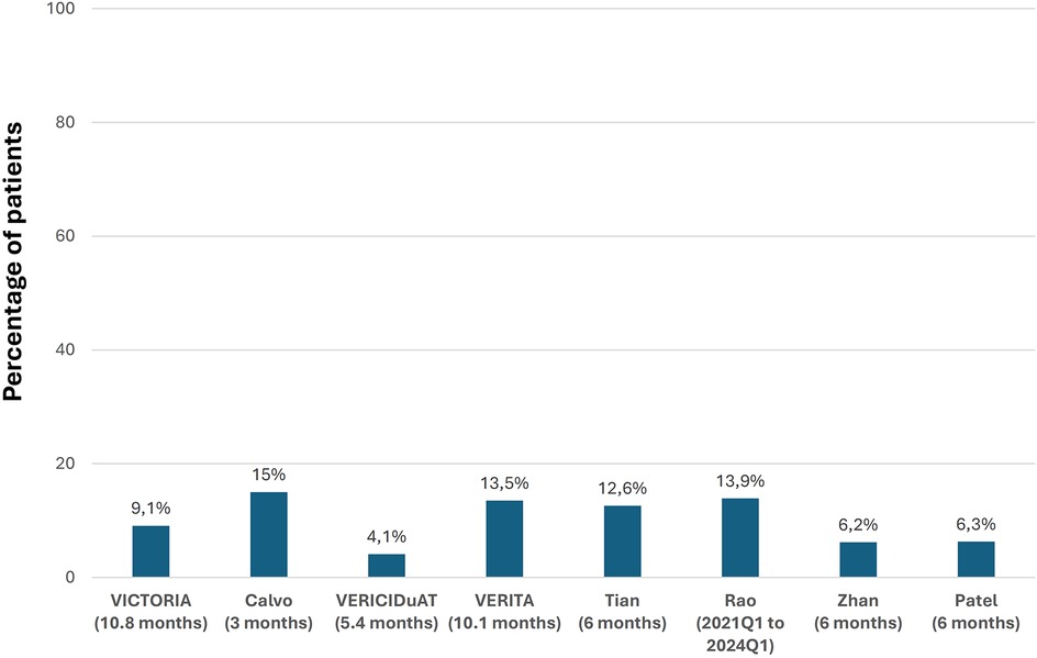 In the VICTORIA trial, over a median follow-up of 10.8 months, the primary outcome event (a composite of cardiovascular death or first HF hospitalization) was recorded in 35.5% of patients treated with vericiguat, death from cardiovascular causes in 16.4%, and hospitalization for decompensated HF in 27.4%. Nine RWE studies analyzed HF and mortality events during the follow-up. In general, rates of hospitalizations for HF and mortality tended to be lower than in the VICTORIA trial. However, the inclusion criteria and the follow-up periods differed between the studies (Figure 3, Supplementary Table S2) (10, 19, 20, 22–24, 28, 31, 36, 40).